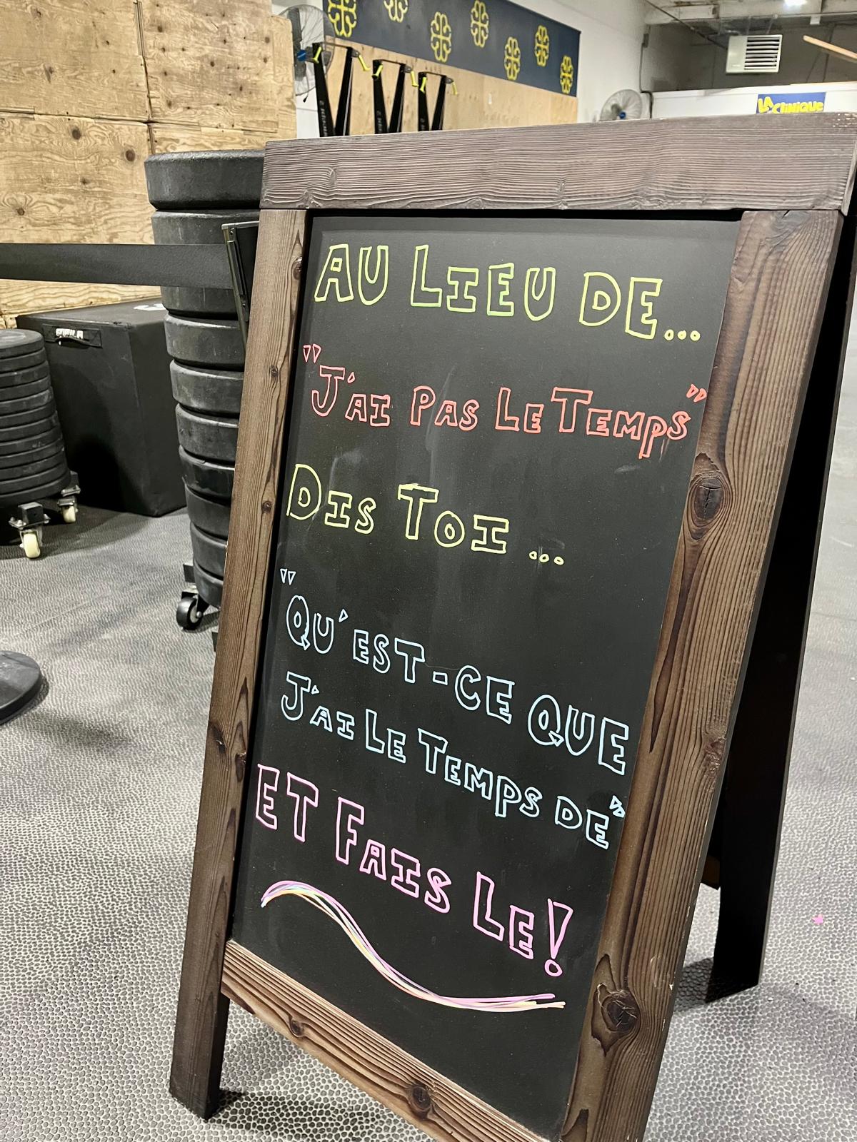 Motivational sign at the entrance of Matthew's neighbourhood gym in Montreal. The sign reminds us to use the time whatever limited time we have to pursue our goals, rather than using our busy schedules as an excuse to not get started.
